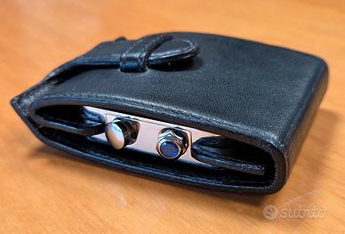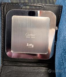 Splendido orologio sveglia Cartier della prestigiosa collezione Santos, in ottime condizioni. Movimento al quarzo Swiss made con funzione di sveglia, perfettamente funzionante. Cassa in acciaio placcato palladio. Custodia in pelle nera per protezione e per appoggio su scrivania. Dimensioni quadrante : 40 x 40 mm. Dimensioni con custodia: 65 x 70 mm.