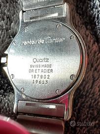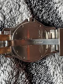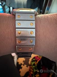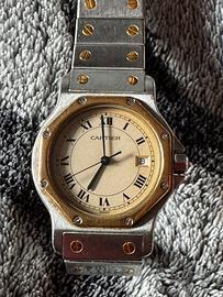 L'orologio mostrato è un Cartier Santos Octagon (o Ottagonale). Questo modello vintage, introdotto originariamente negli anni '70 e popolare negli anni '80 e '90, si distingue per la sua caratteristica lunetta a otto lati fissata con viti a vista, un elemento di design iconico della collezione Santos. Dettagli del Modello Questo specifico esemplare è una versione bicolore in acciaio e oro giallo 18kt. Le caratteristiche principali includono: Quadrante: Bianco classico con numeri romani neri e minuteria a "chemin de fer". Funzioni: Dispone di una finestra per la data a ore 3. Movimento: Esistono versioni sia automatiche (spesso referenza 2966) che al quarzo (spesso referenza 187902). Dimensioni: Solitamente disponibile in varianti da 25mm (femminile) o 30mm (unisex/maschile per l'epoca).