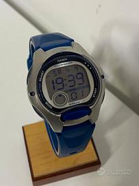 Orologio Casio Collection LW-200L. Si tratta di un modello digitale noto per il suo design sportivo e compatto. Caratteristiche Principali Durata della batteria: Dispone di una batteria a lunga durata dichiarata fino a 10 anni. Resistenza all'acqua: È classificato come resistente all'acqua fino a 50 metri (5 bar), il che lo rende adatto per l'uso quotidiano e brevi docce. Funzioni: Include retroilluminazione a LED, cronometro (1/100 sec - 24h), sveglia giornaliera, calendario automatico e formato 12/24 ore. Materiali: Cassa e cinturino sono realizzati in resina blu, con vetro acrilico bombato
