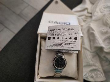 Orologio da donna Casio originale in pratico ed elegante cofanetto regalo, in acciaio, quadrante nero, non resistente all'acqua se non per schizzi (come specificato nelle caratteristiche), mai usato, ancora con cartellino riportante il modello e pellicola sul quadrante (vedi foto). Manuale d'istruzioni e garanzia (non più in vigore ormai) inclusi. Attualmente non funzionante, sicuramente necessita di batteria. €40