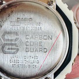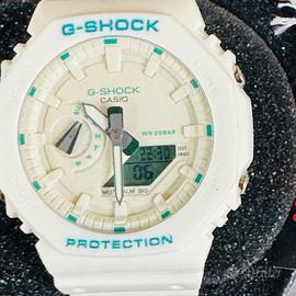 Orologio Casio G-Shock con cassa e cinturino in resina bianca. Il quadrante presenta dettagli in verde acqua.Resistente all'acqua fino a 20 bar.Logo G-SHOCK e CASIO sul quadrante.Scritta PROTECTION sul cinturino.