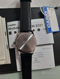 Orologio Casio da polso per uomo, annuncio pubblicato da rivenditore ufficiale che rilascia garanzia sul prodotto a due anni al momento dell'acquisto, dimensioni orologio: 45 × 39,8 × 8,8 mm peso di 49 grammi cinturino nero in pelle, quadrante color argento con segna data e giorno della settimana, movimento al quarzo, vetro minerale, orologio come da foto con scatola etichetta e certificato casio