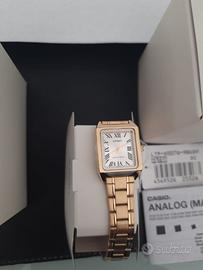 Orologio casio da polso per donna, annuncio pubblicato da rivenditore ufficiale casio, garanzia ufficiale di due anni rilasciata al momento dell'acquisto, dimensioni orologio: 31 × 22 × 7.5 mm peso di 51 grammi con cinturino in acciaio inossidabile color oro con chiusura a tre pieghe impermeabile con movimento al quarzo, vetro minerale, orologio nuovo come da foto con scatola ed etichetta casio