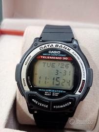 Vendo Orologio da polso Casio modello Data Bank Telememo 30. Negli anni 90' aveva la funzionalita di salvare 30 numeri telefonici in rubrica - Resistente all'acqua fino a 50 metri.. Funziona da Cronometro , da allarme , sveglia, cinturino in gomma..