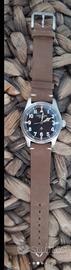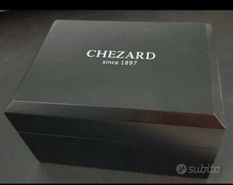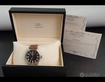Orologio Chezard Since 1897 movimento automatico Seiko. Cassa acciaio da 39mm. Vetro zaffiro. Corona a vite. Cinturino originale in pelle. Luminescenza su indici e sfere. Set completo di scatola, garanzia e storia del marchio. Acquistato ad Aprile 2024. In ottime condizioni.