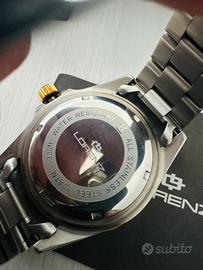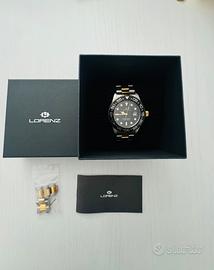 026125AA Lorenz orologio solo tempo da uomo in acciaio bicolore 026125AA usato solo per sostituire la batteria, perfetto! Orologio Lorenz chrono movimento solo tempo al quarzo, cassa da 42mm in acciaio con fondello serrato a vite e corona in acciaio dorato posizionata al 3 con impresso logo Lorenz, bracciale bicolore in acciaio satinato e fascia centrale in acciaio dorato lucido modello Oyster con chiusura deployante, lunetta in acciaio dorato con fondo nero e numeri dorati, vetro piano minerale con lente al tre, quadrante nero datario al 3 con indici e lancette in acciaio dorato e materiale luminoso, WR 100 metri