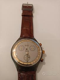 Orologio Chrono Swatch modello Goldfinger Ag1990 con cinturino originale. Funzionante con pila nuova. Modello raro. Dalla lancetta dei minuti si è staccato un pezzetto di vernice che si trova dove è indicato 35.