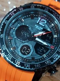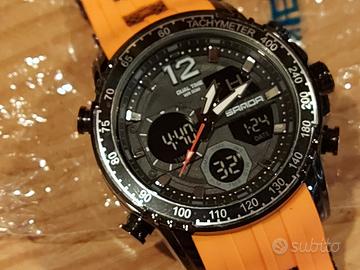 Orologio Sanda acciaio. Cinturino arancio silicone. Orario doppio digitale e analogico. Subacqueo 5 atm. Funzione cronografo, sveglia, calendario. Bello. NUOVO. Ancora implasticato, con targhetta