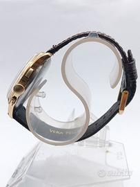 CHRONOGRAPHE SUISSE ANNI '50 - VINTAGE CHARM Proponiamo in vendita un classico intramontabile dell'orologeria svizzera della metà del secolo scorso: un Chronographe Suisse in condizioni di conservazione strepitose, caratterizzato da un'eleganza senza tempo e un'estetica "warm gold" tipica degli anni '50. 📋 SCHEDA TECNICA: Modello: Cronografo meccanico a due contatori (Bicompax). Epoca: Circa 1950-1955. Cassa: Oro rosa placcata con punzonaturatura a 10kt, diametro classico da 37mm (esclusa corona), anse sottili e allungate che ne esaltano la vestibilità. Quadrante: Originale dell'epoca con una splendida patina avorio/champagne. Numeri arabi applicati al 12 e al 6, indici a freccia, scritte "Chronographe Suisse" e "Antimagnetic" perfettamente nitide. Movimento: Meccanico a carica manuale su base Landeron (Cal. 48/51), robusto e di facile manutenzione. Funzioni cronografiche con smistamento a camme perfettamente funzionanti. Vetro: Plexiglass bombato nuovo. Cinturino: Pelle di lucertola marrone scuro, che ne sottolinea il carattere vintage e formale. ✨ DETTAGLI DI PREGIO: L'orologio si presenta con un quadrante non ristampato, che mantiene tutto il fascino della sua storia grazie a una leggera e uniforme ossidazione naturale. La cassa in oro rosa dona un calore unico, rendendolo l'accessorio perfetto sia per un abbigliamento elegante che per un look vintage ricercato. Viola Orologi, Poggiomarino NA