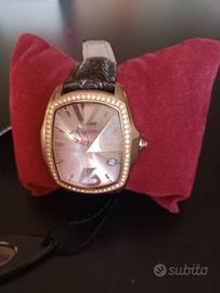 Elegante orologio Chronotech con cinturino nero in pelle, quadrante con brillantini e fondo del quadrante rosato. Confezione originale con libretto istruzioni. Mai usato né provato.
