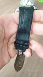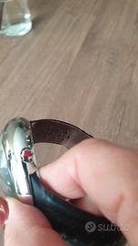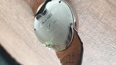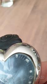 Elegante orologio da polso da donna con cassa a forma di cuore. Il quadrante è nero con indici luminosi e piccoli cristalli.