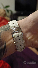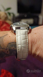 Orologio Chronotech analogico, con brillantini che incorniciano il quadrante in acciaio, cinturino bianco in vera pelle e chiusura in acciaio. Vetro a forma di prisma. Pila nuova e perfettamente funzionante