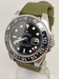 Orologio cinese GMT Master II Quadrante Nero in acciaio Referenza 116710LN Quadrante nero scritta verde con calendario, cassa in acciaio in condizioni ottime, bracciale in tessuto sintetico verde militare Meccanica a carica automatica