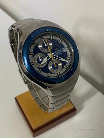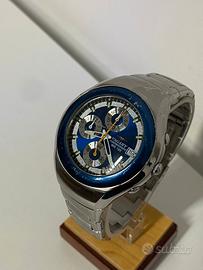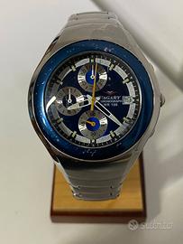 cronografo Vagary, un marchio appartenente al gruppo Citizen. Questo modello specifico presenta un design vintage con cassa e bracciale in acciaio inossidabile e un quadrante blu con tre contatori.