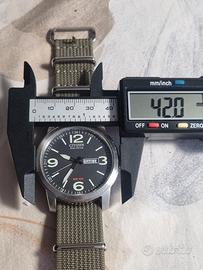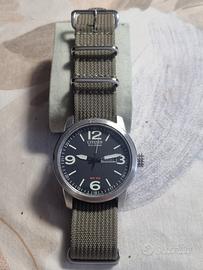 L'orologio in descrizione é un classico esempio di Field Watch, robusto e funzionale. Il cuore dell'orologio é un Eco-Drive, che non ha bisogno di batterie perché si ricarica con qualsiasi fonte di luce (naturale/artificiale). La sigla "WR 100" indica che è impermeabile fino a 10 bar (100 metri). È adatto per nuotare o fare snorkeling, ma non per immersioni professionali. Quadrante in stile militare, con numeri grandi e lancette luminescenti per una lettura rapida. Doppia complicazione di Giorno e Data a ore 3 (in questo caso impostato su "SAB 24"), con giorno a scelta fra Italiano o Inglese. Scala delle 24 ore riportata sul rehaut interno (il bordo esterno del quadrante). Cassa in acciaio inossidabile e cinturino tipo "NATO" in tessuto tecnico verde oliva, molto resistente e lavabile, NON Citizen !! Questo design appartiene solitamente alla serie Citizen Chandler (identificato con il codice BM8180-03E). È molto apprezzato dagli appassionati per la sua estrema affidabilità. Perfettamente funzionante e come si vede dalle foto in perfetto stato, nessun segno di usura nè graffi. Fornito con scatola originale. Non accetto offerte a ribasso, orologio pari al nuovo.