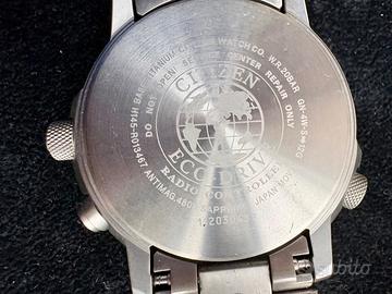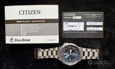 Citizen Pilot Super Titanium CB0230-81E Eco-Drive quadrante nero, utilizzato pochissimo perchè troppo grande per il polso di mio figlio. Corredo completo:scatola, garanzia, manuale. Garanzia ufficiale Citizen 5 anni. Movimento eco-drive, resistenza acqua 20 atm, vetro vetro zaffiro, diametro 43, chiusura fold clasp, materiale cassa e bracciale in super titanio, spessore 12, base di calibro H145, precisissimo (si sincronizza automaticamente con segnali atomici), carica solare, riserva di carica 2 anni, data, calendario perpetuo, world time (26 città), regolo calcolatore da pilota, lancette e indici luminescenti. Peso 99 gr.