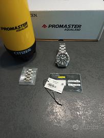 Full set. Classica scatola a forma di bombola per immersioni, controscatola, card di garanzia, talloncino e maglie per la regolazione del bracciale.