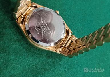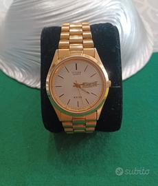 Buonasera, Come da titolo vendo Orologio Citizen quartz wr 100 da uomo. Il cinturino si presenta color oro e con ña cassa color oro. Il quadrante è color champagne, riportante secondi e date. La pila è nuova.