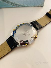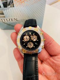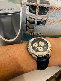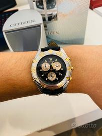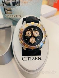 Orologio da polso Citizen resistenza all'acqua WR100. - Cassa in metallo con dettagli dorati. - Cinturino in pelle nera. - Quadrante nero con indici e lancette a contrasto. - Tre sotto-quadranti per cronografo. - *** Subdial dei secondi non funzionante - Scatola originale - Cronografo ok - Hora ok - Alarm ok - Data ok