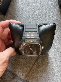 Orologio realizzato per il compleanno del Signor Rosso by Diesel. Nero con dettagli in oro. Conturino in gomma. Mai usato (ancora con pellicola nel vetro). Scatola e contenitore inclusi.