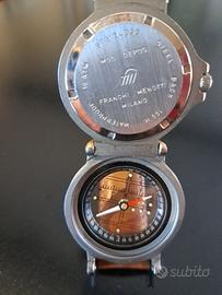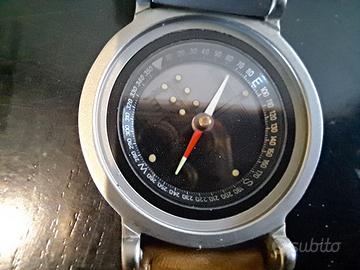 Perfettamente funzionante movimento al quarzo con datario, ghiera quadrante e ghiera bussola girevoli, cinturino in pelle e in caucciù originale, custodia. Segni di usura come da foto.