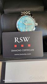 Quadrante: Blu turchese con linee strutturate. Lancette e indici in acciaio. Quadrante rotondo.