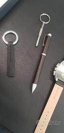 orologio con cinturino in pelle ,penna rivestita in pelle marrone e portachiavi in pelle nera , con cacciavite e 2 batterie di ricambio.