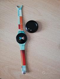 Dotato di scatola originale, libretto delle istruzioni e contact charger (quel cerchietto vicino alla foto dell'orologio che serve per poggiare sopra l'orologio e caricarlo tramite USB, ha l'ingresso type A).