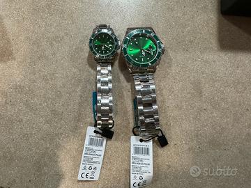 Vendo set di 2 orologi coordinati (uomo + donna) con elegante quadrante verde brillante e cinturino in acciaio.