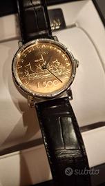 Orologio nuovo mai indossato, in tiratura limitata, cassa da 36 mm in acciaio, con quadrante e fondello in oro giallo, rappresentanti il dritto e il rovescio della moneta. movimento automatico Swiss Made SW300-1.