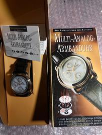 Nuovo con scatola, orologio della Germania è un CMI, cinturino in pelle , placato oro . Funziona a carica solare e con funzioni multi-analogiche, analogiche (come calendario o fasi lunari) (Multi-Analog-Armbanduhr) con tecnologia a energia solare Questo orologio trasforma la luce solare o artificiale in pura energia. Non è necessaria la sostituzione della batteria. riserva di carica di 6 mesi ( funziona al buio per 6 mesi ) 1. Giorno della settimana: (In alto a sinistra) Indica se è lunedì, martedì, ecc. 2. Data del mese: (In alto al centro) Indica il numero del giorno (da 1 a 31). 3. Ciclo 24 ore: (In basso) Ti dice se sono le 10 del mattino o le 10 di sera (22:00), utile per regolare l'ora correttamente. [1, 2] È un orologio pensato per chi vuole l'estetica complessa di un cronografo ma preferisce avere sott'occhio le informazioni del calendario giornaliero. * Funzioni: Multi-analogico con tre piccoli quadranti (sub-dials) che indicano solitamente il giorno della settimana, la data del mese e le 24 ore. * Design: Cassa laminata oro con cinturino in pelle nera Anche ritiro in zona