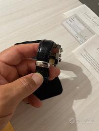Il cronografo presenta: cronometro centrale, contatori (30 minuti a ore 12, 12 ore a ore 6), secondi continui a ore 9, datario a ore 6. Il vetro è zaffiro antiriflesso, la cassa è spazzolata in acciaio, impermeabile fino a 50m, con cinturino in pelle e fibbia deployante.