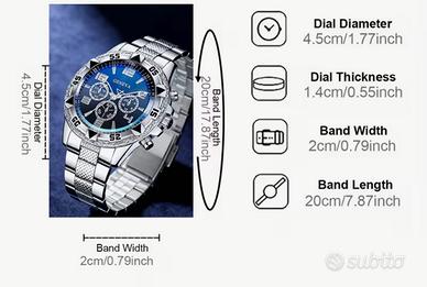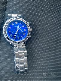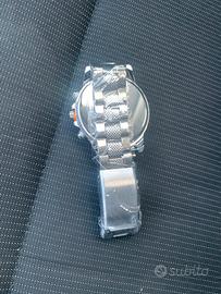 Orologio nuovo ancora con pellicole di fabbricazione contemporanea al quarzo dotato di scatola. Quadrante ble con indici e piccoli simil contatori lunetta svasata vetro bombato - bracciale in metallo color argento orologio dall’estetica molto ricercata ad un ottimo prezzo