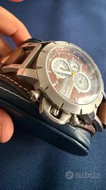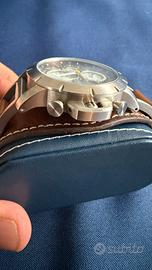 Presenta una cassa in acciaio inossidabile da 45 mm e un quadrante marrone con cronografo e datario.