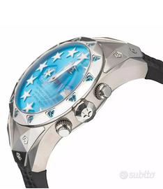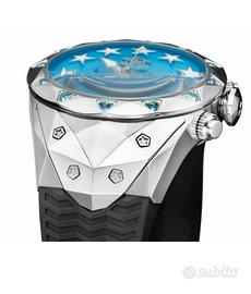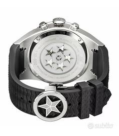 Cassa sfaccettata in acciaio 316L da 49 mm che con i numerosi angoli si ispira all'architettura del bombardiere stealth F-117, vetro zaffiro, Super Luminova, impermeabile 100 MT .