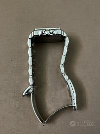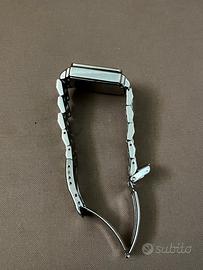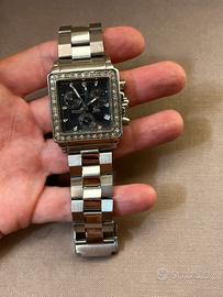 Cassa quadrata da 30 x 30 mm con ghiera incastonata di pietre bianche. Quadrante nero con pietre al posto degli indici, lancette e indicatori cronografo in acciaio inox.