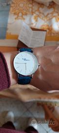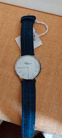 Orologio da polso Chronostar con cinturino in tessuto a quadri blu, funge anche da cronografo,completo di scatola regalo e cartellino. - Cassa color argento. - Quadrante bianco con indici.