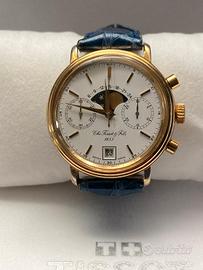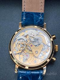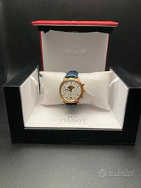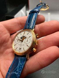 Bellissimo cronografo Tissot con fasi lunari. Perfettamente funzionante di recente revisione. Movimento meccanico a carica manuale cal. Valjoux 7734. Serie limitata del 1980. Dial bianco con indici a tacche dorate. Sfere dorate. Contatori ad ore tre ed a ore nove. Datario ad ore sei. Fasi luna centrali. Movimento a vista con fondello in vetro. Cassa placcata da 38 mm. escluso corona. L'orologio si presenta in ottime condizioni con lievi segni di normale utilizzato. Vetri perfetti. Cinturino nuovo in pelle blu. Corredato di scatola.