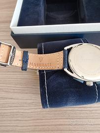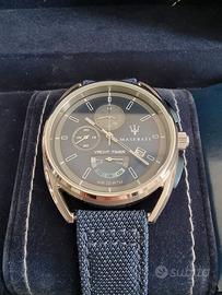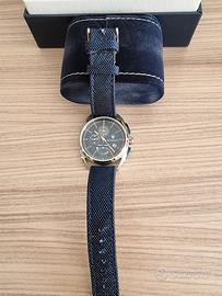 Articolo pari al nuovo. Funzionante con pila. Cinturino interno in pelle esterno in Completo di scatola, scontrino e istruzioni. Diametro 4 cm.Lunghezza 24,5 cm Color Argento e blu navy