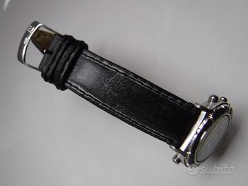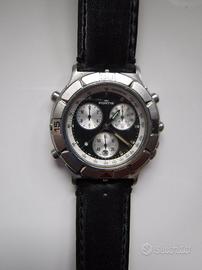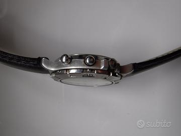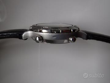 Marca: FORTIS con Allarme timer, Cronografo d'occasione al quarzo. Cassa: Acciaio/steel Quadrante: Argentato/silver Vetro: vetrino minerale indurito (graffi minimi) trasparente Cinturino: Originale vecchio di pelle nera esternamente (cm 23 x 2 cm esteso), interno beige Profondità subacquea: 80 m (tested) Movimento: Citizen 3510 meccanismo al quarzo (auto) analogico con lancette Diametro: 39 mm Riferimento inciso: 524.16.120 Epoca: anni 1980-1990 Stato: funzionante e già con batteria e libretto di istruzioni multilingue. Non si accettano resi.