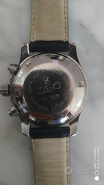 Orologio uomo ZZero con cassa rotonda in metallo, (stainless steel case - cassa in acciaio inossidabile), quadrante scuro, cinturino in pelle nero. Movimento al quarzo, cronografo, datario, resistente all'acqua 20 atm, praticamente nuovo, batteria sostituita da poco, con custodia originale che però è un po' rovinata all'esterno, vedi foto 5).