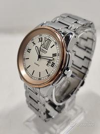 Condizioni: Buone condizioni generali. Presenta lievi segni di usura sulla lunetta e sul cinturino, visibili solo da vicino, che non ne compromettono l'estetica. Batteria inclusa e funzionante.