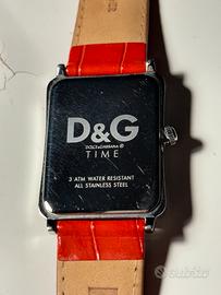 Orologio Dolce & Gabbana Time con cassa rettangolare in acciaio inossidabile dal design contemporaneo e funzionale. Il quadrante argentato con finitura spazzolata si distingue per una configurazione insolita che include l'indicazione del giorno della settimana tramite un settore a ventaglio nella parte superiore con lancetta rossa retrograda, oltre a una finestra datario a ore 3. Il fondello in acciaio, serrato a pressione, riporta il marchio esteso Dolce & Gabbana, la specifica di impermeabilità fino a 3 ATM (30 metri) e la dicitura "All Stainless Steel". L'orologio è equipaggiato con un cinturino originale in pelle rossa con stampa coccodrillo, che ne accentua il carattere distintivo. L'esemplare si presenta in buone condizioni estetiche, con graffi superficiali da utilizzo visibili sulla cassa e in modo più marcato sul fondello, mentre il quadrante e il vetro mantengono un'ottima leggibilità.