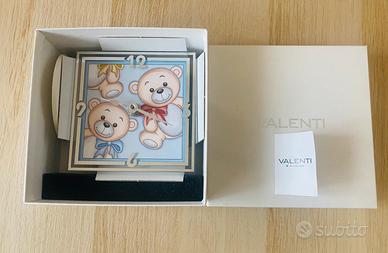 Vendo orologio tema orsetti, tema plexiglass, da appoggio bimbo in argento celeste della Valenti mai utilizzato per doppio regalo uguale, perfettamente funzionante, nella sua scatola oroginale e con il suo cartellino di autenticità originale, con display analogico e movimento al quarzo. Dimensioni cm 13x13. Ottimo anche come idea regalo. Possibilità di spedizione.