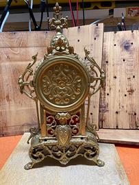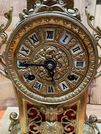 Come da foto,perfettamente funzionante. Molto pesante circa 3,7kg interamente in ottone,dotato di piccolo inserto per silenziare il doppio campanello che segna ore e mezzore, la carica dura poco più di una settimana con chiavetta di carica fatta con due monetine da un centesimo. Alto poco più di 30cm