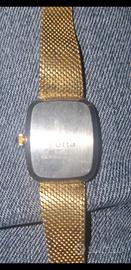 Orologio da polso vintage Elgin al quarzo con cassa e cinturino a rete color oro, quadrante color champagne e indici con numeri romani.