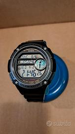 orologio al quarzo water resistent 10 bar, cassa da 54 mm e cinturino in resina, quadrante a cristalli liquidi con indicatore orario per più fusi orari e datario, retroilluminato con sveglia. l'orologio presenta 2 leggeri graffi sul vetro ma è funzionante, manca di scatola e istruzioni, mai usato.