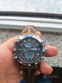 Orologio da polso con cinturino in gomma marrone e nero. Quadrante analogico / digitale e lunetta con tachimetro.