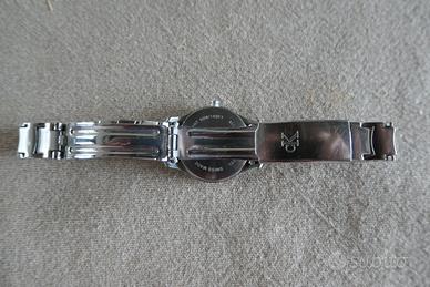 Orologio Calvin Klein da polso donna con cinturino in acciaio, quadrante bianco madreperla (diametro 22 mm) e lancette stilizzate. Completo di libretto e scatola originale, e corredato da 4 maglie aggiuntive per eventuale allungamento cinturino. Tutto in acciaio inossidabile, resistente all'acqua. Alimentazione: batteria. Acquistato nel 2005.