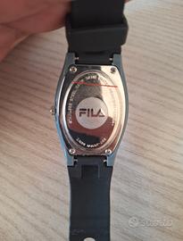 Orologio al quarzo Fila Watches "Cutie", modello vintage (2004). Water resistant, cinturino in gomma nero. Misure: cinturino 22 cm di lunghezza, Quadrante 3x2 cm. Si tratta di un modello da bambino, ma è adatto anche a uomo o donna con polso piccolo. Nuovo, con scatola, custodia e certificato di garanzia. Batterie da poco sostituite.